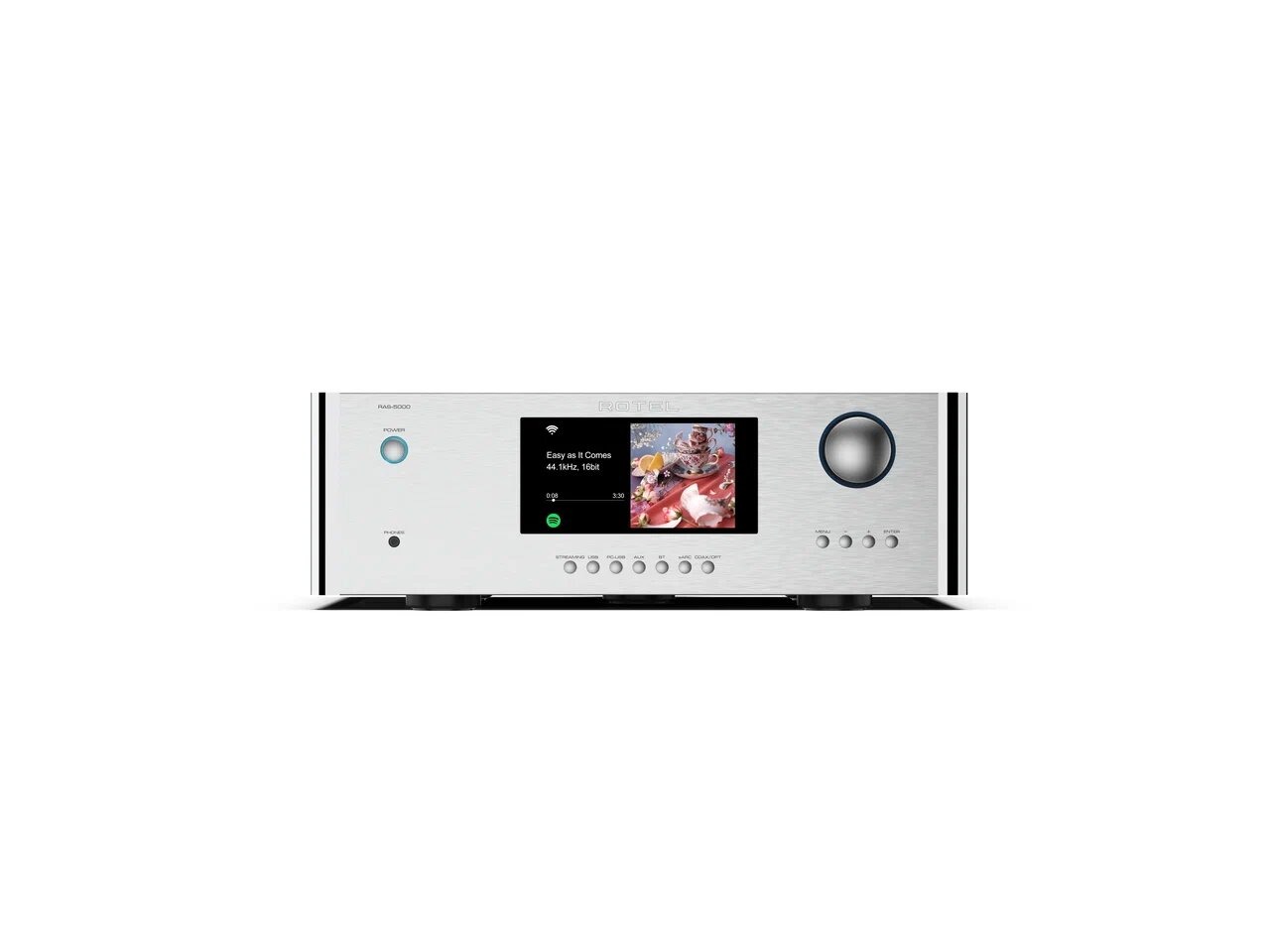 Дополнительную гибкость в использовании Rotel RAS-5000 придает встроенная стриминговая платформа, фактически превращающая усилитель в самостоятельный источник музыки. Подключение к сети производится по Ethernet или Wi-Fi, и аппарат воспроизводит музыку с доступных сетевых накопителей, через AirPlay2 или Chromecast, и с популярных онлайн-сервисов. Есть поддержка кодека MQA и технологии Roon. Кроме того, Rotel RAS-5000 оснащен USB-разъемом для портативных накопителей и Bluetooth с кодеками aptX HD и AAC.