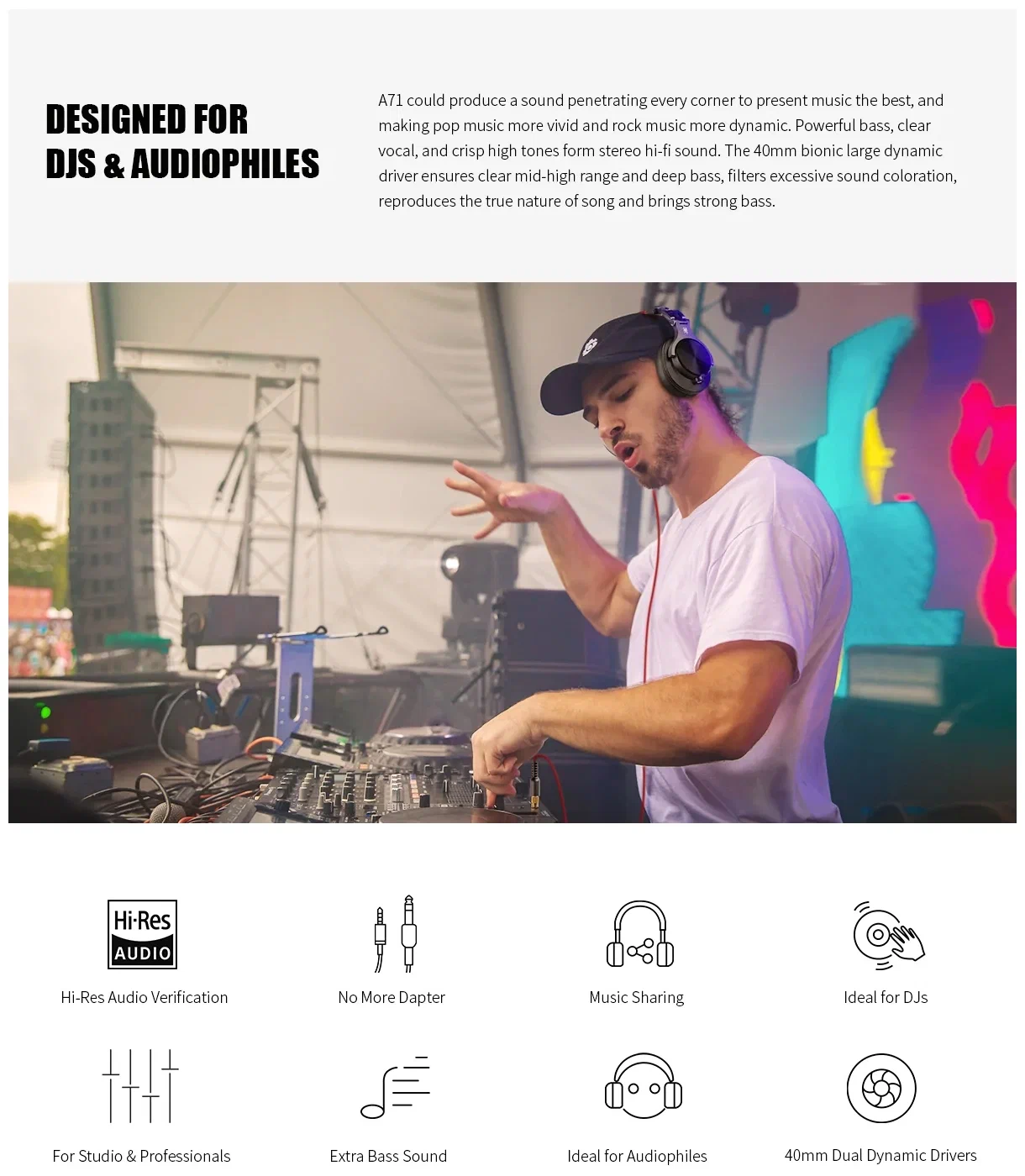 Чрезвычайно популярная в мире среди начинающих диджеев модель, благодаря не только наличию всех необходимых "фишек", отличному звуку, но и комплектации, которая включает в себя провод с микрофоном, превращающих A71 в отличную гарнитуру для общения с друзьями. Специальный разъем, предотвращающий "выдергивание" кабеля, оценят активные меломаны.