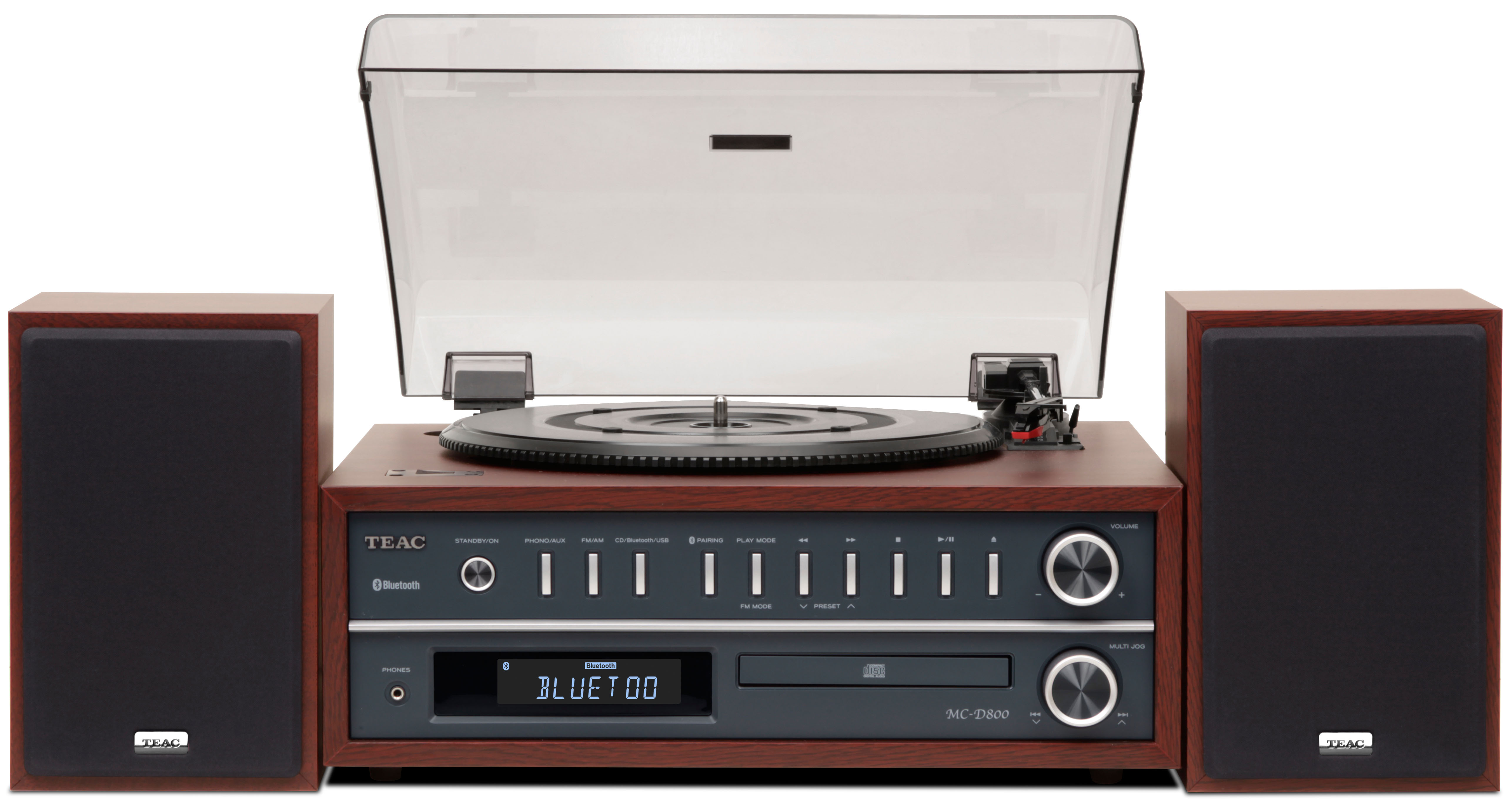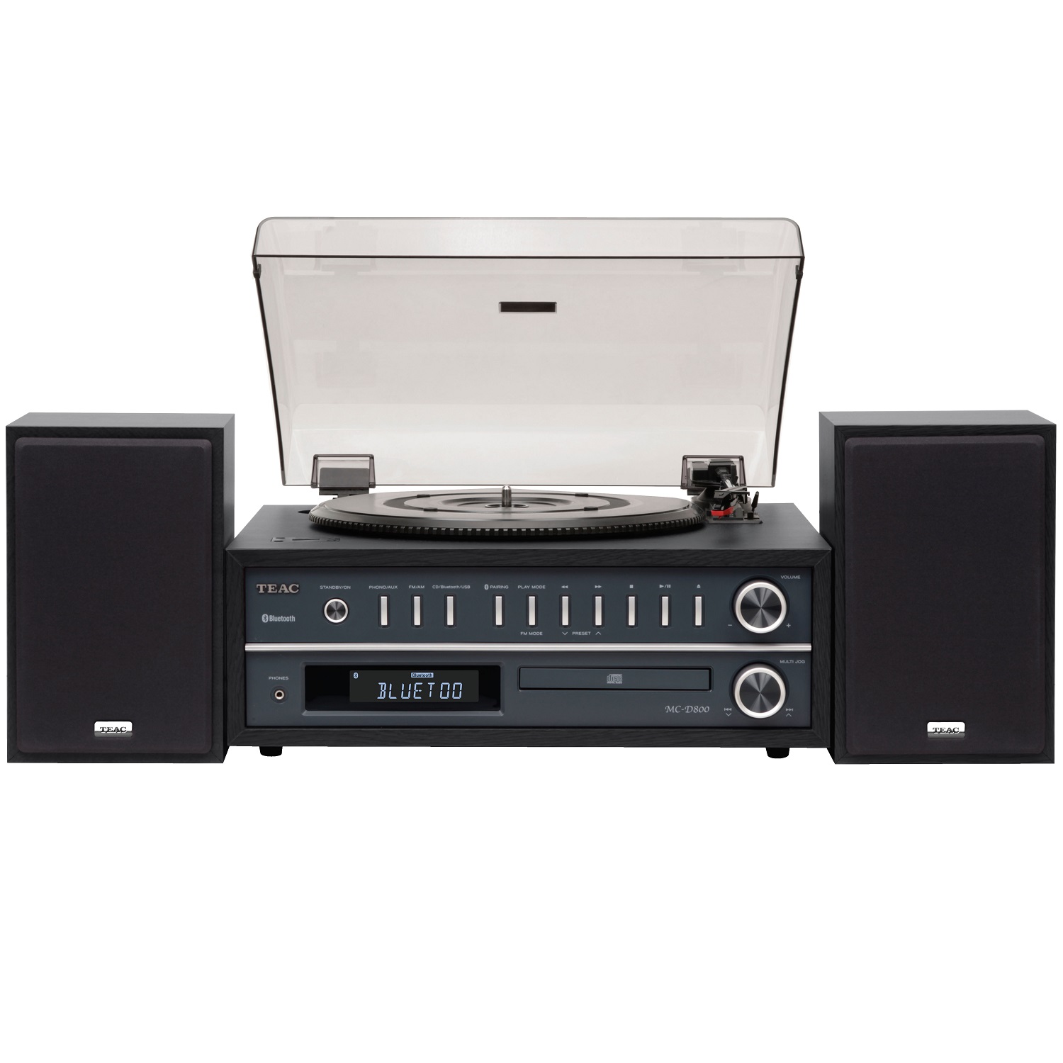 В верхней части TEAC MC-D800 смонтирован проигрыватель винила, который не только подчеркивает ретро-статус данной модели, но и является весьма востребованным сегодня источником сигнала. Проигрыватель поставляется полностью настроенным и имеет электронное переключение скорости вращения диска. Проигрыватель оснащен классическим пассиковым приводом и обеспечивает хорошее звучание как новых, так и винтажных пластинок. Предустановленный звукосниматель имеет сменную иглу, благодаря чему обслуживание проигрывателя не вызовет каких-либо затруднений.